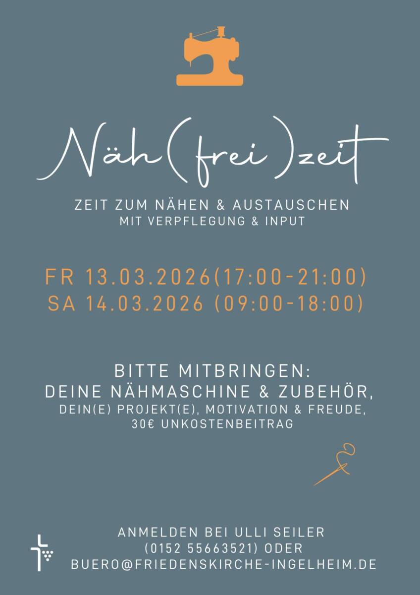 Veröffentlicht am 15. Januar 2026 Gepostet von: Heinz Kraft Kategorien: Details zur Veranstaltung 13. März 2026 17:00 bis 21:00 Drucken Kontakt zum Veranstaltungsleiter 6911 2026-03-13YOUR NAME* YOUR EMAIL* YOUR PHONE Food Choice 1 2 3 4YOUR MESSAGE Buche deine Tickets 2026-03-13 00:00:00 Näh(frei-)zeit Freitag-2026-03-13 https://www.friedenskirche-ingelheim.de/vielseitiger/naehfrei-zeit/edate/2026-03-13 Name* Deine E-Mail* LAST NAME YOUR PHONE YOUR ADDRESS ADDITIONAL NOTES 6911 Tickets auswählen Offline-Zahlung $0 Credit or debit card Bank NameAccount No: 0000 1400 1211IFSC Code: 00001321Branch Address Zurück zu den Details Danke du Herzlichst Veranstaltung Näh(frei-)zeit Freitag Datum & Zeit 17:00 bis 21:0013. März 2026 Bestellung # 000000 Teilnehmerin und Teilnehmer Veranstaltung Näh(frei-)zeit Freitag Ticket Datum & Zeit 17:00 bis 21:0013. März 2026 DRUCKEN